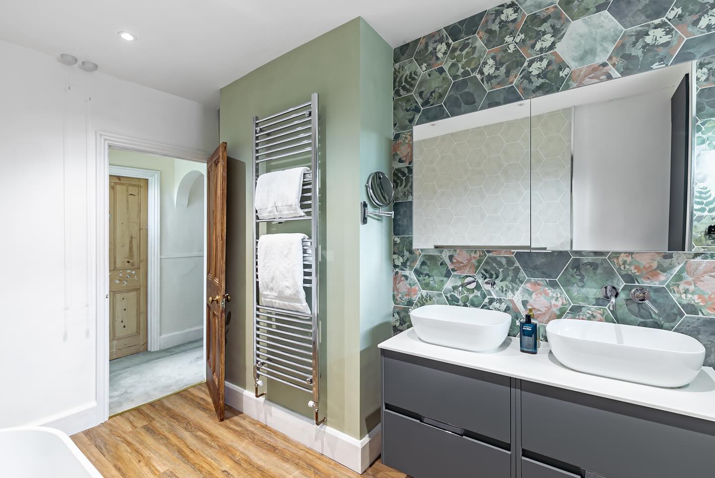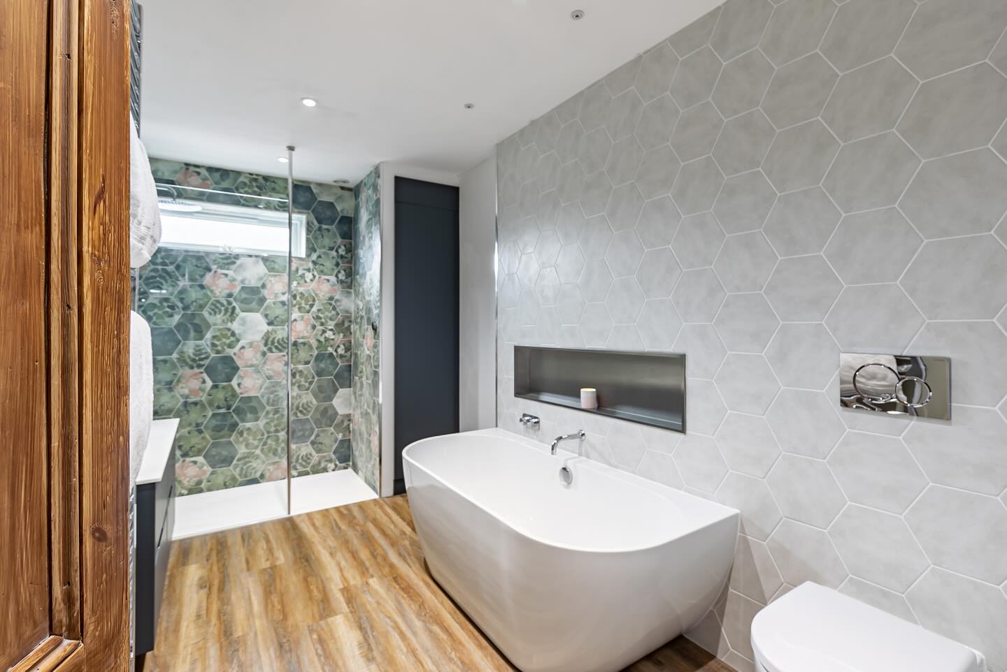 This beautifully transformed bathroom is the result of carefully reconfiguring the original layout to create a brighter, more spacious, and highly functional retreat. By combining two separate rooms into one, we were able to significantly increase the overall footprint, allowing for a more open and luxurious design. A key feature of the space is the striking botanical hexagon tile, which brings texture, depth, and a sense of calm nature-inspired elegance throughout the room. This statement tiling is perfectly balanced with clean white sanitaryware and sleek, contemporary fittings, creating a timeless yet modern aesthetic. To enhance both practicality and flow, a bespoke cupboard was designed and installed to the right of the shower. This cleverly conceals the boiler while providing discreet storage, ensuring the room remains visually uncluttered without compromising functionality. A new window was introduced within the shower area to maximise natural light, transforming what was once a darker space into a bright and inviting environment. This addition not only improves ventilation but also enhances the overall sense of openness. The finished space features a spacious walk-in shower, a freestanding bath for relaxation, and a double vanity unit with wall-mounted taps, offering both style and everyday convenience. Warm wood-effect flooring adds contrast and warmth, grounding the design and tying the whole scheme together. Overall, this project showcases how thoughtful planning, bespoke solutions, and high-quality finishes can completely redefine a bathroom, turning it into a refined and tranquil sanctuary.